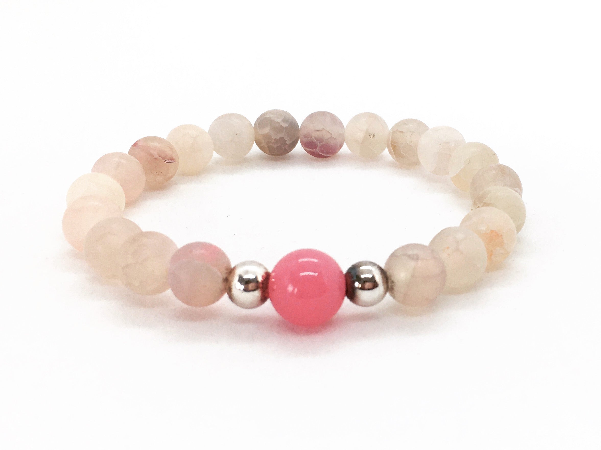 A mixture of 8mm crackled light Pink Agate and a brighter 10mm Pink Agate as the center stone along with two Sterling Silver spacers. Size medium, 7 inches on a stretch cord. Genuine stones. Since our products are made with natural stones, the colours may vary from stone to stone, making each one beautiful and unique just like its wearer.