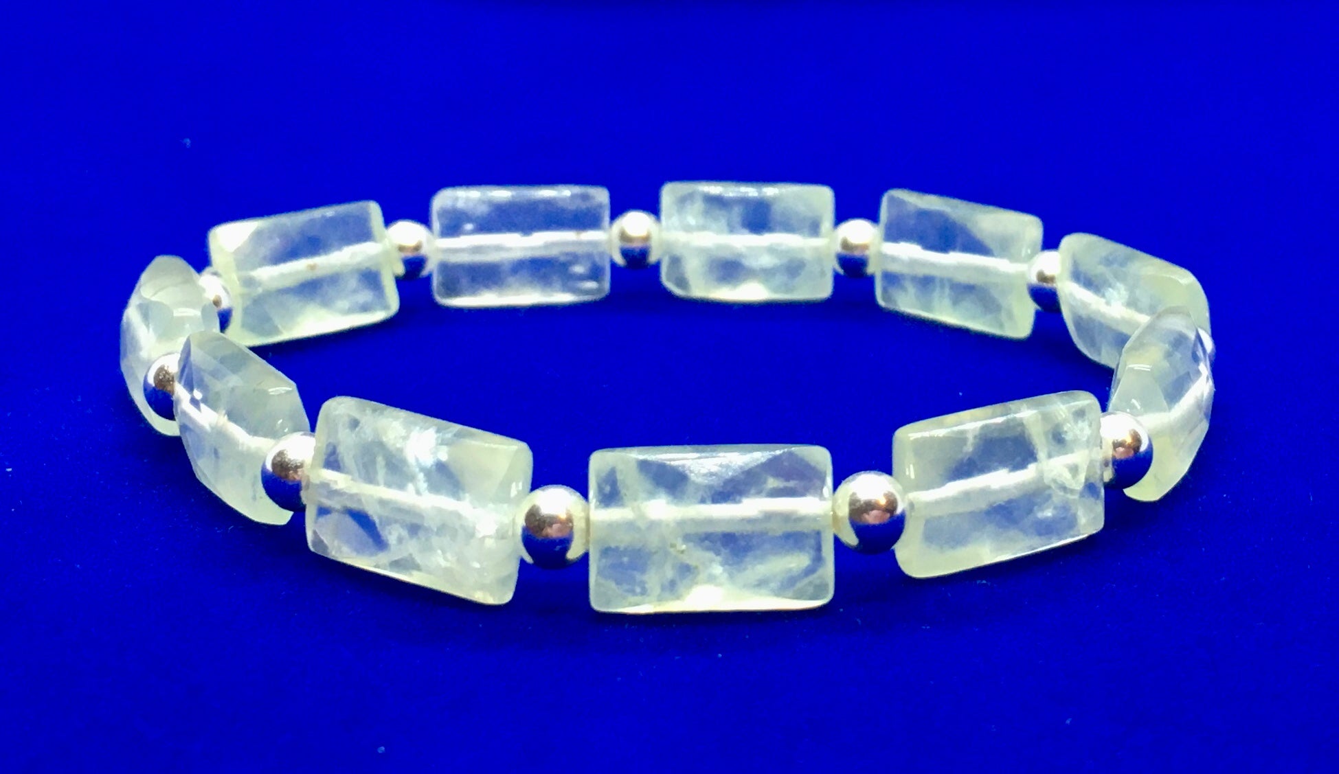 This bracelet is made of 12mm faceted flat rectangular Prehnite with alternating 2mm Sterling Silver beads on a stretch cord, measuring 7 inches. Since our products are made with natural stones, the colours may vary from stone to stone, making each one beautiful and unique just like its wearer.