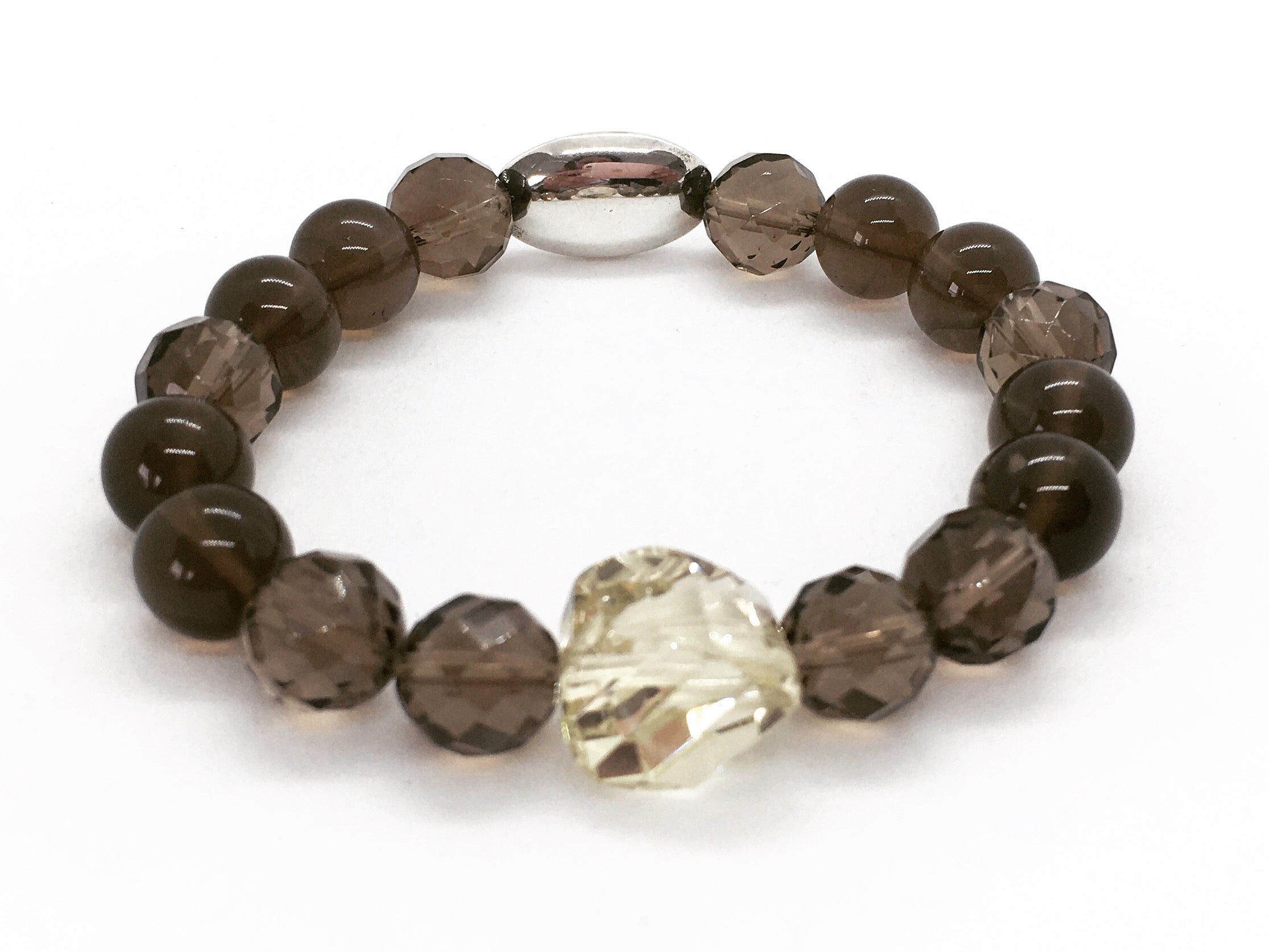 A mixture of faceted and smooth Smoky Quartz, Lemon Quartz and Sterling Silver Bracelet. Fits size medium-large, 7-7.5 inches on a stretch cord, 8mm & 10mm genuine stones with the Lemon Quartz as the center stone a 15mm SS spacer. Since our products are made with natural stones, the colours may vary from stone to stone, making each one beautiful and unique just like its wearer.