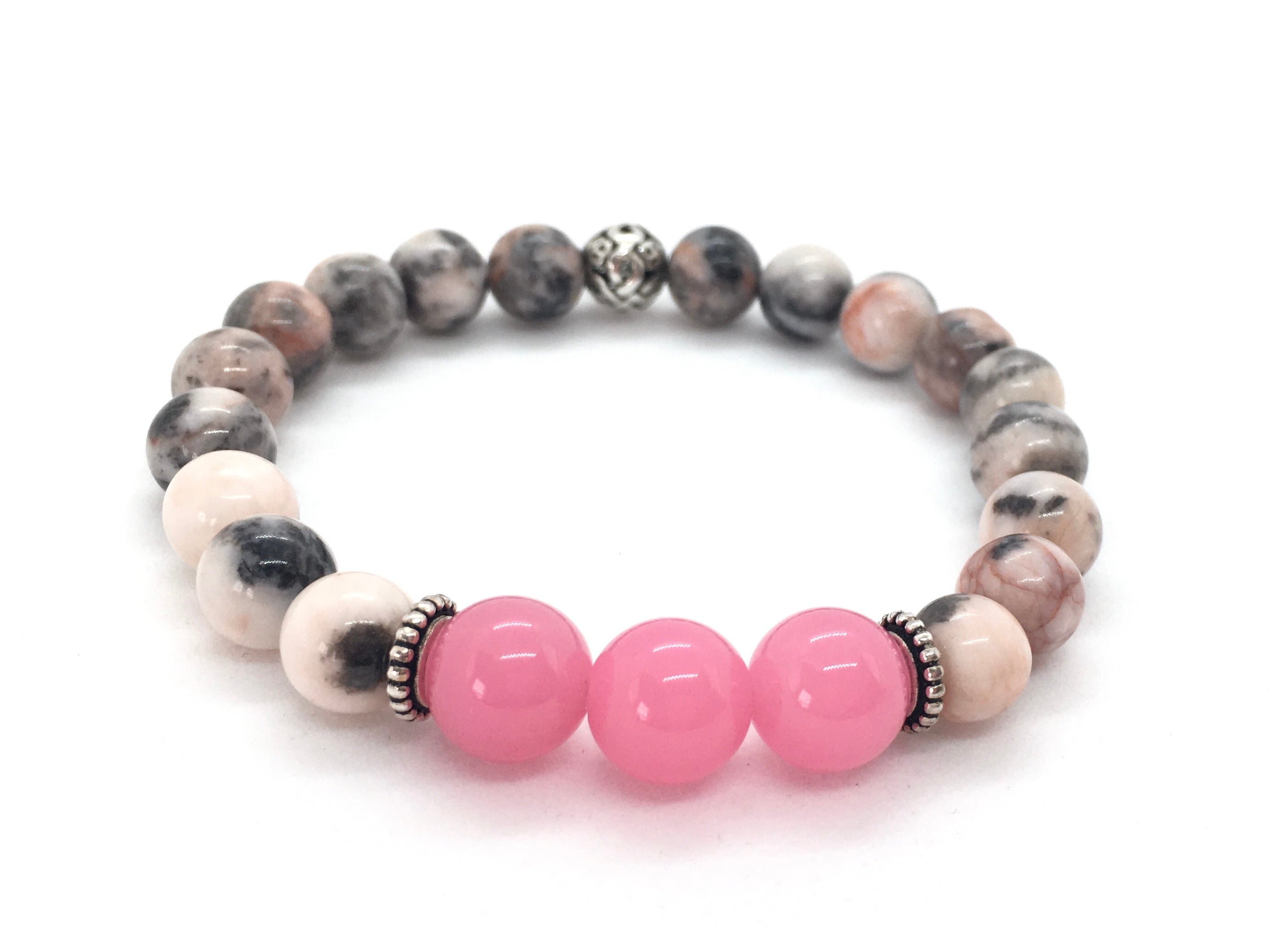 Pink Jasper, Pink Agate and Sterling Silver Bracelet. Size medium-large, measuring 7-7.5 inches on a stretch cord, 8mm and 10mm genuine stones with SS spacers. Since our products are made with natural stones, the colours may vary from stone to stone, making each one beautiful and unique just like its wearer.